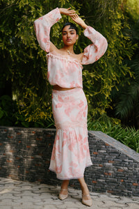 Featuring the Soft Stitch Lace Co-ord Set by Trisara's Fuss Over Me Collection. This blush pink printed off-shoulder set is adorned with lace trimmings, featuring a fitted skirt at the waist and hips with a flared bottom for a flattering, feminine silhouette.