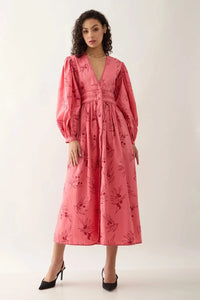 Solace Dress a captivating blend of elegance and structure, this dress showcases our Grape print in a flattering fit-and-flare silhouette. The flowing design moves with ease, creating a sense of grace with every step. The deep V-neckline adds a subtle hint of allure, while the delicate front button closure enhances the refined aesthetic. Billowy long sleeves with gathered cuffs evoke a romantic charm, perfectly paired with the intricate mosaic print detailing that elevates the overall design. A versatile piece that effortlessly combines comfort and sophistication.