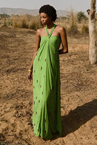 The Solange Dress is a lovely parrot green, and features subtle embroidered beaded elements along with a halter-top neckline. This dress is perfect for a vacation or a relaxing outing.