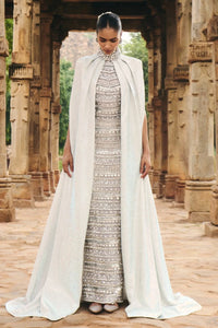 This white multimedia gown features stone embroidery on hard net fabric. It has a halter neckline and is set on a soft net lining fabric. Paired with a flowy cape made with Melon Crepe.