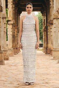 This white multimedia gown features stone embroidery on hard net fabric. It has a halter neckline and is set on a soft net lining fabric.