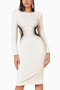 Featuring Sometsuke Zoge Burakku Glam Stretch Dress by Siddartha Tytler from Checkmate Collection. Illuminate your wardrobe with the ivory and black hand-embroidered crystal gradient knit dress. Accentuating intricate crystal gradient embroidery and stylish cutouts, this dress blends sophistication with modern edge for a captivating, standout look.