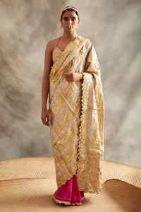 Featuring a gold and silver zari-woven lampi panelled saree palla with a pure crepe body and paired with a rich gold zari-woven blouse — a striking ensemble that blends opulence with grace.