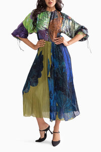 Featuring Sonam Multi Dress by Saaksha & Kinni from Botanica Collection. A daisy print midi dress with tie-up sleeves and a button closure, accentuating a slip for added coverage and comfort. This design combines floral patterns with functional elegance.