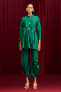 Featuring the Sonata Kurta Set from Ridhi Mehra's Jazz-A-Jashn Collection. This stylish ensemble features a bottle green chanderi overlapped kurta paired with matching pants, offering effortless elegance and comfort. Perfect for any occasion, it beautifully blends traditional charm with modern sophistication!
