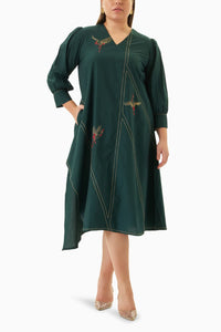 Featuring Song of the Sea Dress by Auruhfy from Advaya Collection. Discover effortless elegance in this asymmetric dress, adorning side inseam pockets, gathered sleeves, and hand-embroidered bird motifs, its a perfect blend of comfort with refined style. This handcrafted piece is ideal for any occasion and exudes sophistication and charm with every detail.