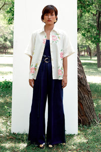 Hand-embroidered top made in linen featuring camp collar neck and crochet lace details on sleeves. It is a perfect casual top and can be styled with linen trousers