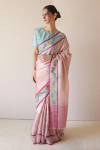 The Soulful Embrace Jamdani Saree is crafted from handwoven organza mulberry silk, with a stunning floral Jamdani creeper weave unfurling on the borders post-pleats, and delicate stripes flowing along the bottom border.
