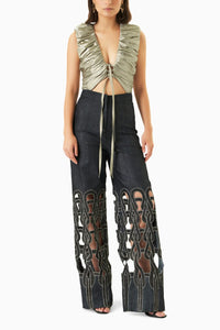 Step into the future of fashion with our Space Beige Reflective Tie-Up Denim Jumpsuit. This stunning piece features a unique reflective finish that catches the light beautifully, while the tie-up design allows for a customizable fit. The standout knotted cutwork appliqué detail adds an artistic touch, making it a true statement piece. Perfect for both day and night, this jumpsuit combines comfort with cutting-edge style, ensuring you turn heads wherever you go!