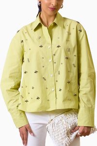 Add a vibrant touch to your wardrobe with the *Sparkle Bloom Embellished Shirt*. Designed in a fresh lime-green hue, this chic button-down shirt features scattered crystal and bead embellishments for a subtle yet eye-catching sparkle. With a classic collar and full-length sleeves, it effortlessly blends sophistication with playful charm, making it perfect for both casual and dressy occasions.