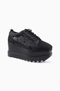 Our Speakeasy wedge sneakers are adorned with cutdana embroidery, accented with pearls both big and small. Each detail shimmers against the dark canvas, while the front features lace fabric, adding an extra touch of drama.