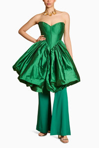Featuring Spectrum Green Bauble Corset with Flared Pants by Siddartha Tytler's Spectrum Collection. This bold ensemble features a green taffeta bauble corset paired with elegant flared pants. The striking design and luxurious fabric create a dramatic, fashion-forward silhouette that combines sophistication with modern flair.