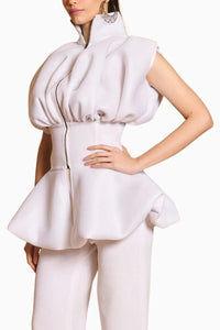 Featuring Spectrum Ivory Bauble Jacket by Siddartha Tytler's Spectrum Collection. This ivory neoprene mesh jacket features a cinched waist and dramatic bauble design, offering a bold, sculptural silhouette. Its unique structure and modern detailing make it a statement piece for any contemporary wardrobe.