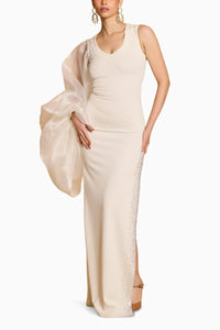 Featuring Spectrum Ivory Crystal Bauble Sleeve Gown by Siddartha Tytler's Spectrum Collection. This ivory knit slitted gown is adorned with gradient crystal detailing and a striking one-shoulder organza bauble sleeve, offering a perfect blend of elegance, sparkle, and modern sophistication.