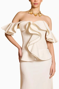 Featuring Spectrum Ivory Flap Corset by Siddartha Tytler's Spectrum Collection. This ivory microfiber structural corset is enhanced with shoulder flaps and intricate gold piping, offering a bold yet elegant look. A perfect blend of modern design and luxurious detailing.