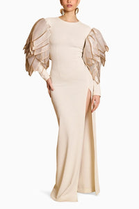 Featuring Spectrum Ivory Petal Gown by Siddartha Tytler's Spectrum Collection. This ivory knit slitted gown is beautifully adorned with gold-binding organza petals, creating a luxurious, sculptural effect. The elegant design offers a perfect balance of modern allure and timeless sophistication.