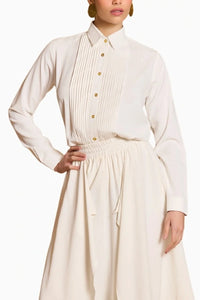 Featuring Spectrum Ivory Pintuck Shirt by Siddartha Tytler's Spectrum Collection. This ivory microfiber shirt features delicate pintuck detailing and elegant gold buttons, offering a refined, classic silhouette. Its luxurious fabric and timeless design make it a versatile addition to any wardrobe.