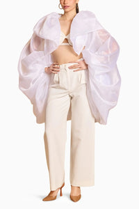 Featuring Spectrum Ivory Sheer Opera Jacket with Korean Pants by Siddartha Tytler's Spectrum Collection. This ensemble pairs an ivory organza bauble opera jacket with luxurious ivory microfiber Korean pants. The dramatic jacket and sleek pants create a striking, contemporary look with an elegant, sophisticated flair.
