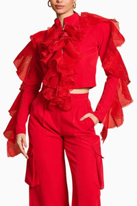 Featuring Spectrum Red Crop Ruffle Jacket by Siddartha Tytler's Spectrum Collection. This red microfiber crop jacket features dramatic organza ruffle detailing, creating a bold, stylish silhouette. The luxurious fabric and unique design make it a striking statement piece for any fashion-forward ensemble.
