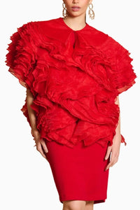 Featuring Spectrum Red Ruffle Jacket by Siddartha Tytler's Spectrum Collection. This red organza jacket is adorned with dramatic ruffles, creating a bold and dynamic silhouette. Its vibrant color and intricate design add a touch of elegance and flair to any outfit.