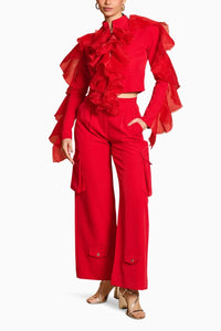Featuring Spectrum Red Utility Pants by Siddartha Tytler's Spectrum Collection. These red microfiber utility flared pants combine functionality and style, featuring a flared design and practical detailing. The luxurious fabric and bold color make them a standout piece for any modern, chic wardrobe.