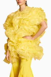 Featuring Spectrum Yellow Ruffle Jacket by Siddartha Tytler's Spectrum Collection. This yellow organza jacket is adorned with dramatic ruffles, creating a bold and dynamic silhouette. Its vibrant color and intricate design add a touch of playfulness and elegance to any ensemble.