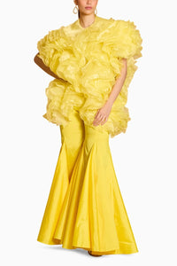 Featuring Spectrum Yellow Ruffle Jacket with Bell Bottoms by Siddartha Tytler's Spectrum Collection. This vibrant ensemble features a yellow organza ruffle jacket paired with yellow taffeta bell bottoms. The dramatic ruffles and flared pants create a bold, fashion-forward look full of elegance and contemporary flair.