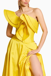 Featuring Spectrum Yellow Structural Corset by Siddartha Tytler's Spectrum Collection. This yellow taffeta corset features a bold, structured design that shapes and sculpts the silhouette. The luxurious fabric and striking color make it a powerful statement piece for a fashion-forward, elegant look.