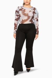 A bold bodysuit featuring an abstract brown and light blue print for striking contrast. The close-fitting silhouette is elevated with gathered sleeve detailing, adding texture and drama—perfect for layering or making a statement on its own.