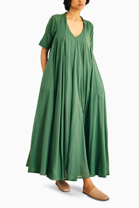Featuring a voluminous sap green maxi dress crafted from breathable, soft cotton mul fabric, this dress is perfect for bright, sunny days. Its flowing silhouette provides comfort and elegance, while side seam pockets add practicality to its stylish design.