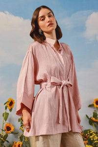 Featuring the Spring Bloom Long Shirt Jacket by 29 India's Sunehri collection. Tailored in organic cotton, this high-neck long shirt jacket is adorned with intricate pintuck detailing, expertly handcrafted to blend refined structure with graceful ease and contemporary elegance.