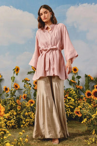 Featuring the Spring Bloom Long Shirt Jacket With Bootcut Pants by 29 India's Sunehri collection. Crafted in organic cotton, this elegant set showcases fine pintuck detailing and a high-neck silhouette, expertly handcrafted for a polished look with modern grace and comfort.
