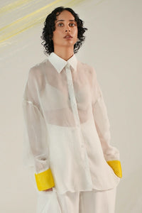 Featuring a sheer white shirt in viscose organza, this piece is designed with a drop shoulder for a relaxed silhouette. The contrast cuff is hand-embroidered with looped PVC cord in Monet Green, complemented by a classic collar and front button placket for a refined finish.