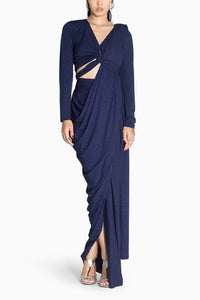 Composition- Shimmer Jersey Colour- Navy Blue Fit- This sari fits true to size, takes the shape of your body as it is a drape. The sari is high waisted, get it according to your high waist size. Components- 2 Product code - SVE431881181601&1200216V