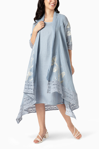 Become the walking canvas in luxurious linen. A free flowing jacket paired with a fitted dress with 3/4th sleeves and Inspired by oil paintings, the Tulip Painting range is exquisitely handcrafted with abstract motifs of the beloved tulip- hand screen printed with elegant thin lines of heat-pressed craft to the fabric and finished with delicate lace details culminating in a glorious homage to the bloom of love.