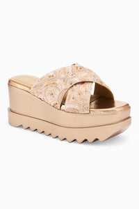 She weaved a sparkling web of tales about all things glitzy. Our Starlet Tales wedge sandals are crafted in shimmery rose gold fabric. Each shoe’s chunky straps that cross over are decorated with abstract rose patterns. The design showcases an array of rich Indian embroidery, such as dabka pitta, cutdana, and salli work. You will also find accents of stones and sequins in complementing colours. Attires from the pink and peaches colour family would dazzle when worn with these Anaar showstoppers. A soiree, a sangeet or the next red carpet, where will you debut these? The artisans of Anaar take 20 hours to carefully construct this pair.