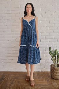 Breezy and effortless, the Starlit Indigo Dress is designed for the warmth of spring and summer. Crafted in a soft, lightweight cotton, the dress features delicate white dotted motifs in a hand-block print. The wrap-style V-neckline is accented with contrast scallop detailing, adding a playful yet refined touch. A tiered, gathered silhouette gives it a flowing drape and flattering movement, finished with contrast piping to break up the pattern. Perfect for brunches, vacations, or sun-drenched strolls.