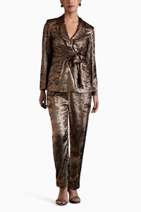 Step into bold sophistication with our metallic blazer co-ord featuring a sleek lapel collar. The long sleeves boast shoulder pads for a touch of glamour, complemented by front belt pockets. The ensemble is completed with slim-fit pants, front button fastening, and stylish black bow ties. Pair it with your favorite pumps for a rocker-chic look that effortlessly blends edge and elegance.