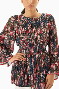 The Sta rry top in Miri print In chiffon with dotted silver lurex is perfect for the da y or the evening. The bodice is plea ted front a nd ba ck with smocking a t the wa ist. Long sleeves with smocked wrist a nd ha nd crochet trims deta iling ma kes it a perfect finish.