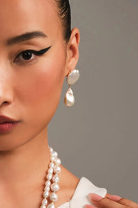 Bold Statement Baroque Drops earrings feature a 3.5-inch white design made from hypoallergenic brass. Each earring weighs 10.76 grams and secures with a pushback closure, perfect for making a striking impression.