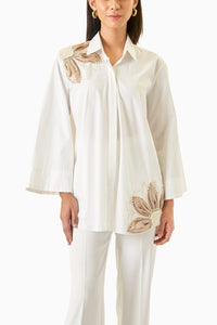 This white shirt is a delightful blend of simplicity and sophistication, elevated by its statement tissue flowers embroidered on the shoulders and along the bottom hem. Crafted from crisp and airy white fabric, the shirt exudes freshness and elegance.