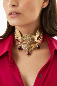 A flock of hand sculpted Swans caught in mid flight, inspired by Art Nouveau movement, this choker accentuated by drops of amethyst tone stones is a beautiful statement piece. It's quite broad on the neck but comfortable to wear, paired here with the Beetle earrings.