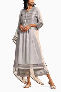 This elegant Steel Grey kurta set is beautifully crafted with an intricate lace pattern on the yoke and sleeves. Delicate beadwork and shell tassels enhance its charm, making it the perfect choice for any occasion. Paired with lacework palazzos and an exquisite pure organza dupatta featuring laces and hand-embroidered motifs, this piece is truly a keepsake.