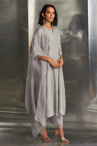 Embrace elegance in this steel grey kurta set by Charkhee, featuring intricate nakshi antique silver handwork. With a side-gathered design and light, flowing silhouette, this kurta is perfect for any occasion. The dreamy pure organza dupatta adorned with nakshi detailing adds a touch of enchantment, while the flowy bottom with a scalloped edge ensures a glamorous finish. The elasticated bottom with a drawstring guarantees comfort and style in every step!
