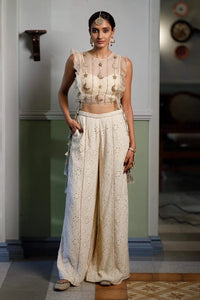 Featuring the Stone Embroidered Bib with Ruffle and Side Tie-Up Bustier, crafted in delicate stone organza with intricate embroidery. Paired with a silk bustier and elegant chikankari Zuveria pant, this set combines texture and style in soothing stone beige hues. Designed for a relaxed fit, it’s perfect for making a chic statement with handcrafted artistry.