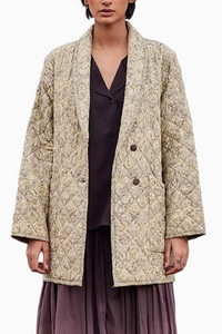 A light mint green and faded lilac, floral printed quilted jacket with shawl collar, full sleeves, front button opening and brick red mul lining.