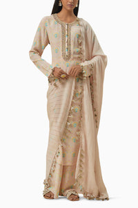 Featuring a stone floral printed crepe kurta with an embroidered yoke paired with a palazzo and a zari chiffon dupatta.