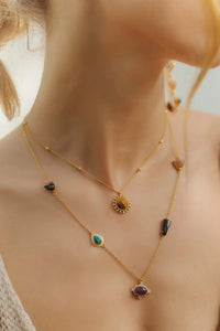 This 22kt gold plated pre-layered necklace with chakra balancing gemstones is the perfect dose of colour and goodness. Use the necklace to elevate a basic T-shirt or a deep necked dress. A perfect option for someone who struggles with layering. Wear this necklace during meditation or as an everyday piece to help you connect with the balance within.