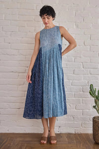 Inspired by the moody charm of rain-laden skies, this dress is dyed in soft, cloud-like hues, evoking the calm before a summer storm. The asymmetric yet fluid silhouette cascades like gentle rainfall, while understated round neck and sleeveless details with a loop and button fastener add a touch of artisanal craftsmanship. Designed for movement and ease, this piece carries the essence of misty mornings and quiet reflections.