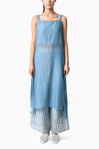 The Strap Tunic Sky Co-ord features a button slit strap tunic with lining on the bodice paired with elasticated pants. Crafted in blue Dabu hand-block printed Chanderi silk, printed in Bagru near Jaipur, it balances structure with comfort and traditional artistry.